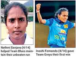 Team Blues, led by Sri Lanka Vice-Captain Harshitha Samarawickrama, continued their unbeaten run in the Women’s NSL T20 tournament, notching up their third win in as many matches.