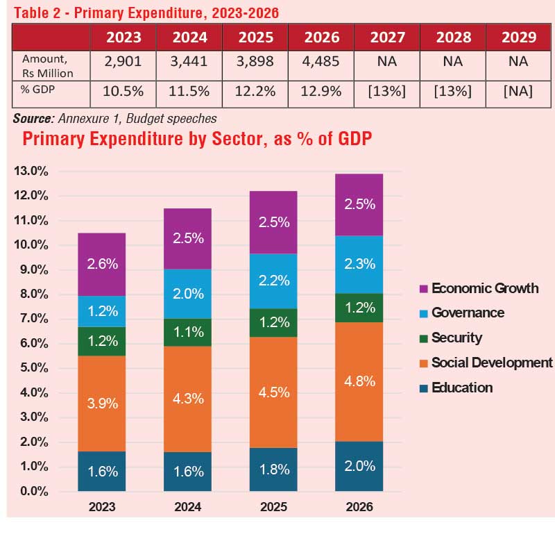 Although the Primary Budget increased from 10,5% to 11.5%, 12.2% and 12.9 of GDP, respectively, from 2023-2026 (Table 2), the allocations for Economic Growth and National Security stayed steady at 2.5% of GDP and 1.2% of GDP, respectively (Figure 1).