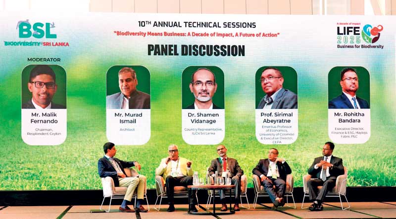A high-level panel moderated by Resplendent Ceylon Chairman/CEO Malik Fernando, explored how businesses are embedding biodiversity into strategy. Panellists included University of Colombo Emeritus Professor of Economics Prof. Sirimal Abeyratne, Architect Murad Ismail, IUCN Country Representative Dr. Shamen Vidanage and Hayleys Fabric PLC Executive Director – Finance and ESG Rohitha Bandara, with expert reflections from UNEP ROAP Senior Regional Adviser on Climate and Environment Aban Marker Kabraji.