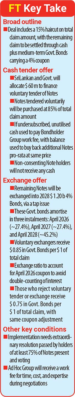 The agreement-in-principle consists of an offer to Note holders to participate in a mandatory and concurrent cash tender offer and exchange offer for Government Bonds issued under a tap of the Sri Lankan Government 2028 $ 1.20 billion 4% Bond.