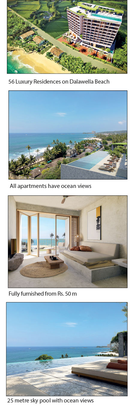 Situated along Sri Lanka’s prestigious “Golden Mile” adjacent to Dalawella Beach, between Unawatuna and Talpe, this BOI-approved development comprises 56 luxury oceanfront condominiums. The project, launched in Colombo, Sri Lanka, offers investors premium residences with prices starting from Rs. 50 million for a fully furnished one-bedroom apartment with parking.