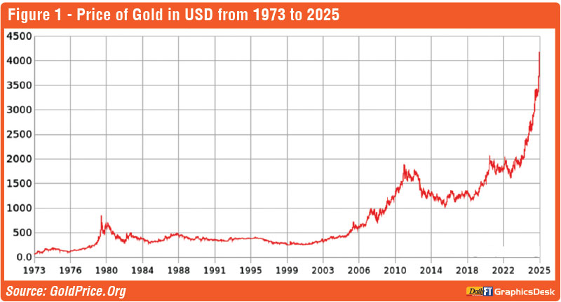 Figure 1 shows the price of a fine ounce of gold from 1973 to October 2025. The price of gold had been at about $ 500 per fine ounce in 1980. This has risen progressively to $ 4,231 per fine ounce by mid-October 2025. In terms of the value of gold, USD has fallen from 62 mg in 1980 to 7 mg in October 2025. This is equal to an 88% decline in the value of gold. Gold prices have started to steep up sharply after Donald Trump was elected to US presidency in January 2025; at that time a troy ounce of gold amounted to $ 2,624.