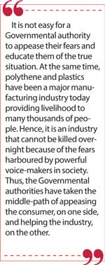 It seems that the Governmental authorities have taken a middle-ground stand in the perennial issue of polythene and plastics. The contemporary society has become anti-polythene and anti-plastic, though its members have been the main users of both products. The deep animosity toward these two products has been inculcated in their mind by the continuous bombardment, mainly through social media, of news on unsubstantiated claims of their horrible health and environmental implications. Since it is a society that does not pay attention or spend time to ascertain the truth, its members have been ready believers of every piece of horrible news thrown at them. It is not easy for a Governmental authority to appease their fears and educate them of the true situation. At the same time, polythene and plastics have been a major manufacturing industry today providing livelihood to many thousands of people. Hence, it is an industry that cannot be killed overnight because of the fears harboured by powerful voice-makers in society. Thus, the Governmental authorities have taken the middle-path of appeasing the consumer, on one side, and helping the industry, on the other.