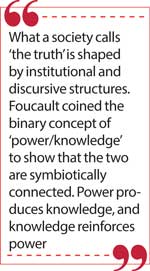 What a society calls ‘the truth’ is shaped by institutional and discursive structures. Foucault coined the binary concept of ‘power/knowledge’ to show that the two are symbiotically connected. Power produces knowledge, and knowledge reinforces power.